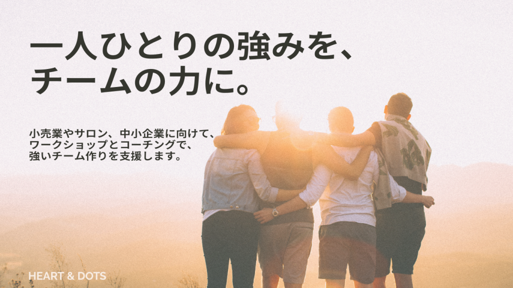小売業やサロン、地域の中小企業に向けて、ワークショップや1on1コーチングを通じたチームづくり・人材育成支援を行っています。それぞれが自分の強みや弱み、価値観を理解し、多様な個性をどのように組み合わせれば成果につながるのかを丁寧に言語化し、行動につなげます。相互理解を深めることで、今いるメンバーで本来の力を発揮できる強いチームづくりを、国家資格キャリアコンサルタントの知見とストレングスファインダーを用いたコーチングで支援します。